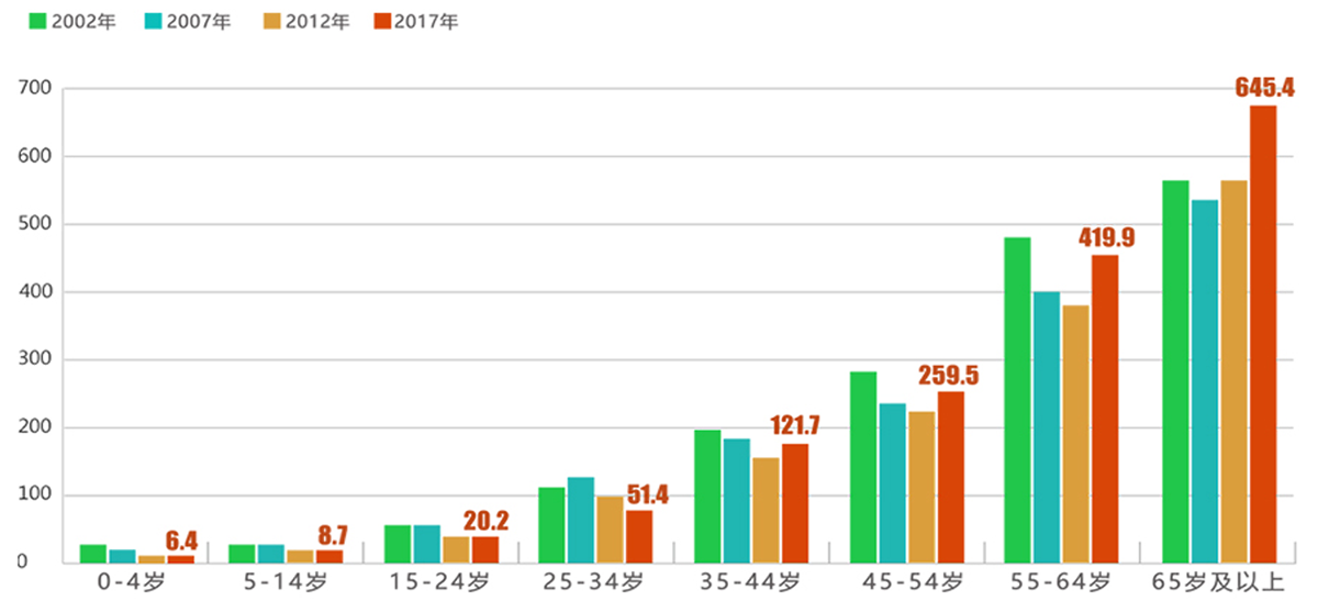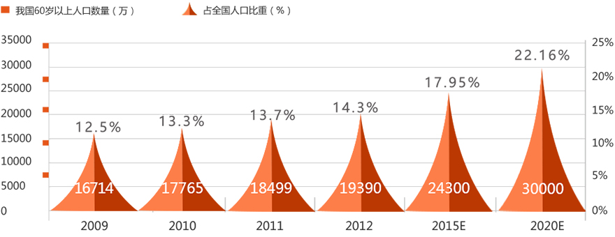 慢性病患病率高低與年齡呈正比,老年人由于身體機能減退,易于出現各類慢性疾病,尤其是心血管疾病、腫瘤、呼吸系統疾病以及周身骨骼退行性病變等。衛生部統計數據顯示,我國65歲以上老齡人慢性病患病率是25-34歲青壯年人口的12.6倍。并且65歲以上的老齡人的兩周就診率為30.29%,住院率達到了15.32%,均遠遠高于其他國家。